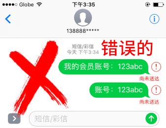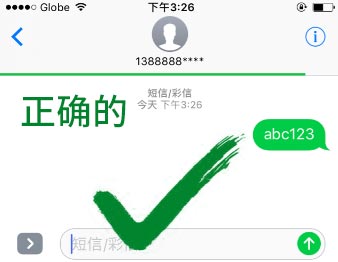 正确范例:您注册的账号为“abc123”,编辑短信内容“abc123”发送到!15810612752